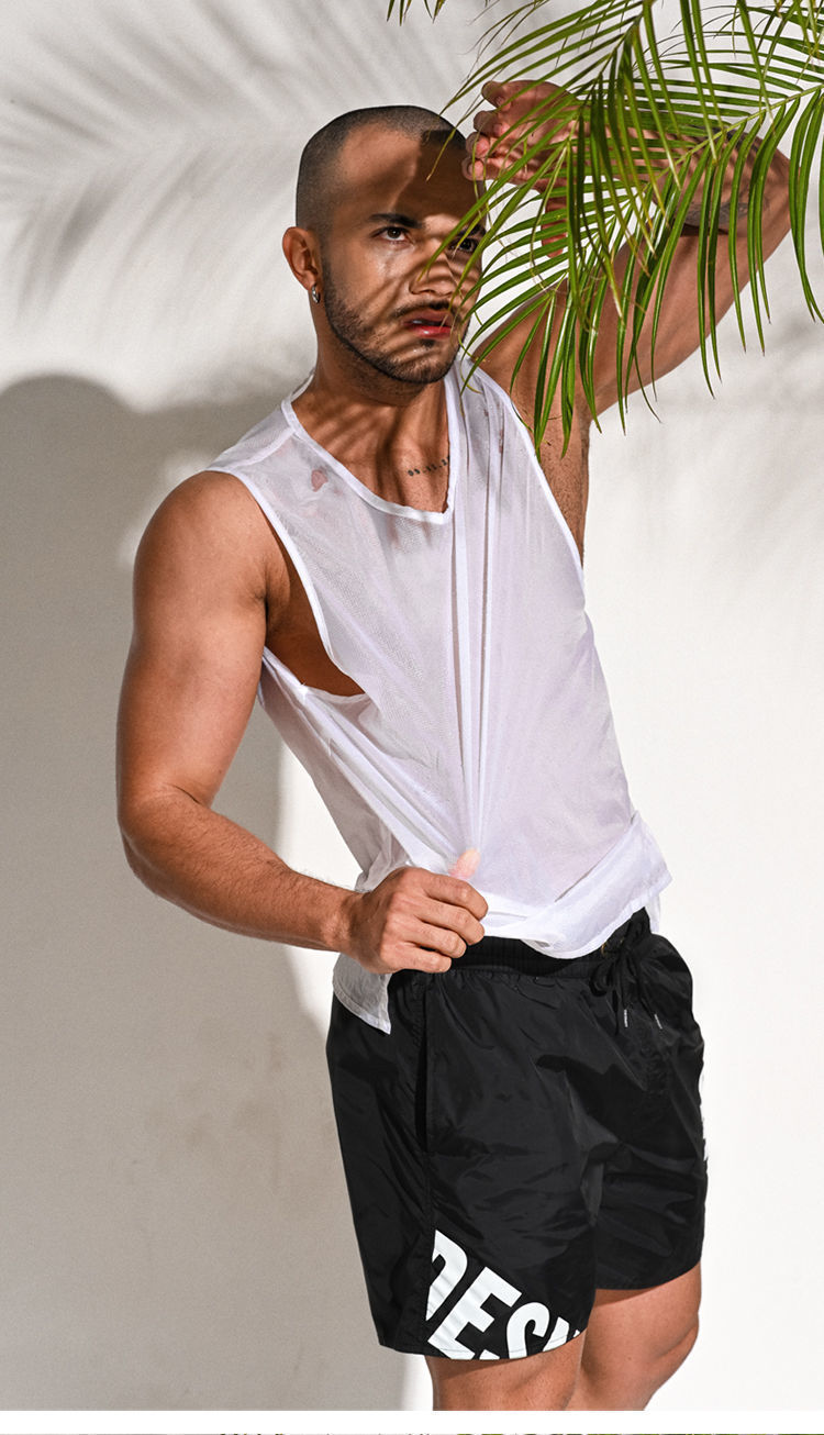 Lightweight quick-dry fabric with elastic waistband. Ideal for beach, gym, or poolside wear.